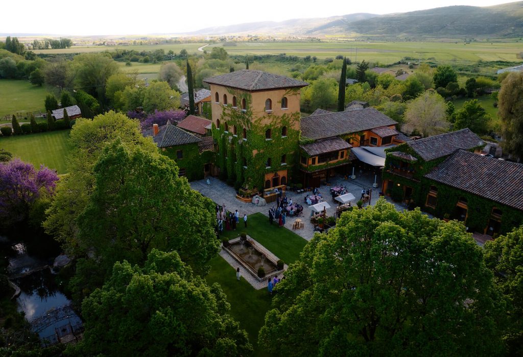 Vista aérea de la finca de bodas en Madrid con el edificio principal, extensos jardines y los invitados disfrutando del cóctel de bienvenida.